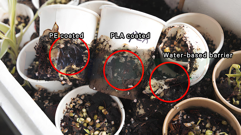 Po 245 dienų vandeninė išklota popierinė taurė buvo visiškai suskirstyta, PLA skaidulos buvo suskaidytos, PLA Hadrupted plėvelė, o PE plėvelė iš esmės buvo nepažeista.